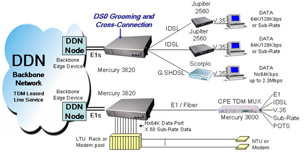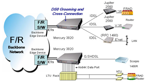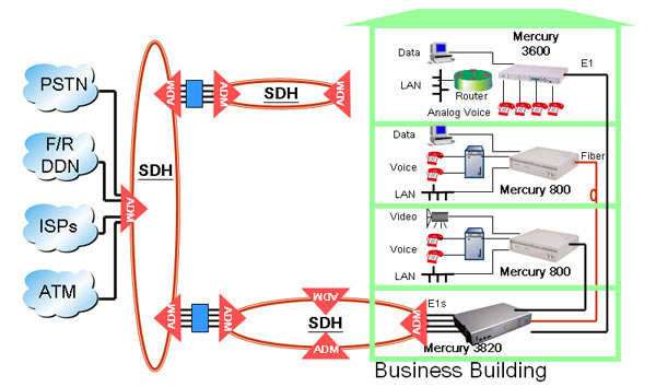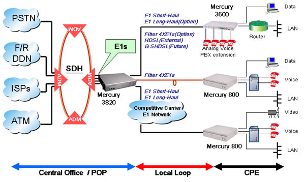 Применения Mercury 1. Предоставление услуг по арендуемым линиям (LL) Mercury работает как TDM Access MUX для предоставления услуг по выделенным низкоскоростным и Nx64Kbps каналам 2. Предоставление услуг по Frame Relay Mercury работает как TDM Access MUX для предоставления услуг по Frame Relay 3. Предоставление услуг по Internet / IP Mercury работает как маршрутизатор E1 Channelized или TDM Access MUX для предоставления услуг Internet / IP Service. 4. Применение Mercury для мультисервисного доступа (POP) 5. Применение Mercury для мультисервисного доступа для бизнес-зданий