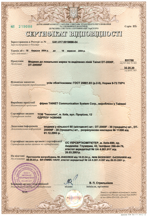 Сертификат соответствия на Tainet DT-2000F