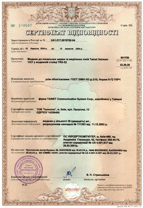 Сертификат соответствия на Tainet XSTREAM 1321 и стойку TRS-32 в Украине