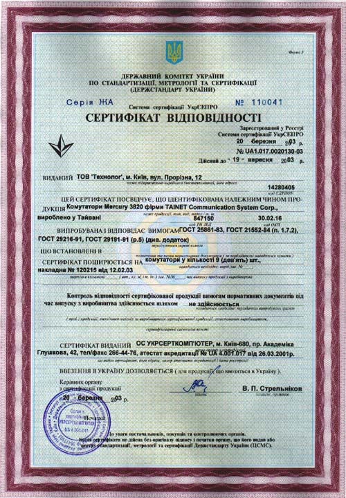Сертификат соответствия на Tainet Mercury 3820 в Украине