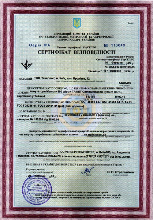 Сертификат соответствия на Tainet Mercury 800 в Украине