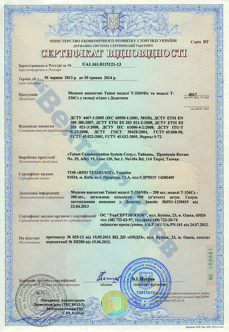 Сертификат соответствия на Tainet T-336Cx, Tainet T- 336NDx в Украине UA 1.161.0115121-13 от 1.06.2013 г